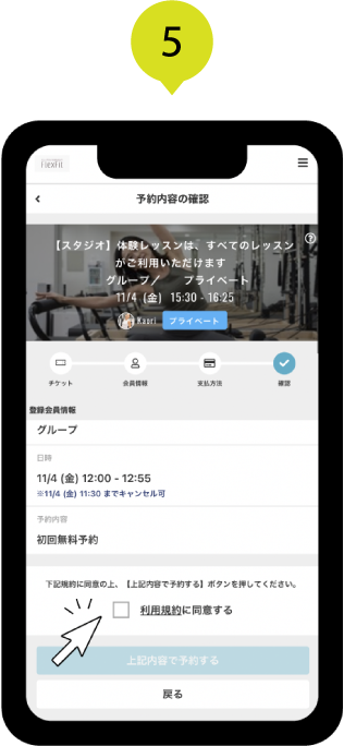 ご予約に間違いがなければ「利用規約に同意する」をクリックして「上記内容で予約する」をクリック